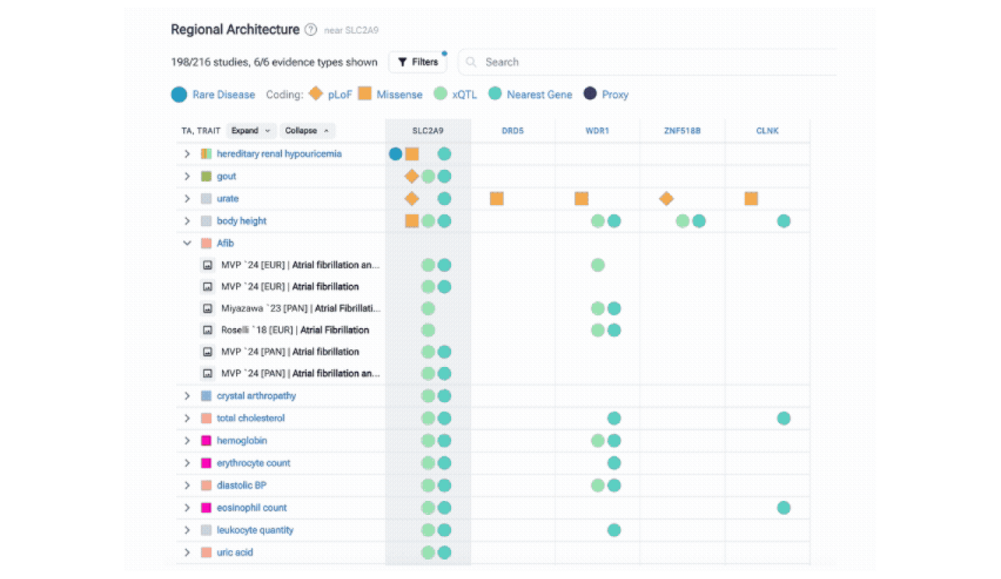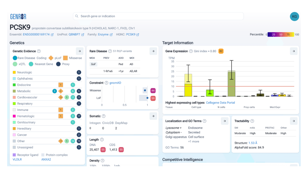 Querying by gene will provide a first-look at all genetic, genomic, and competitive intelligence around the target. The detailed page provides more insight into the type of genetic evidence supporting the hypothesis.